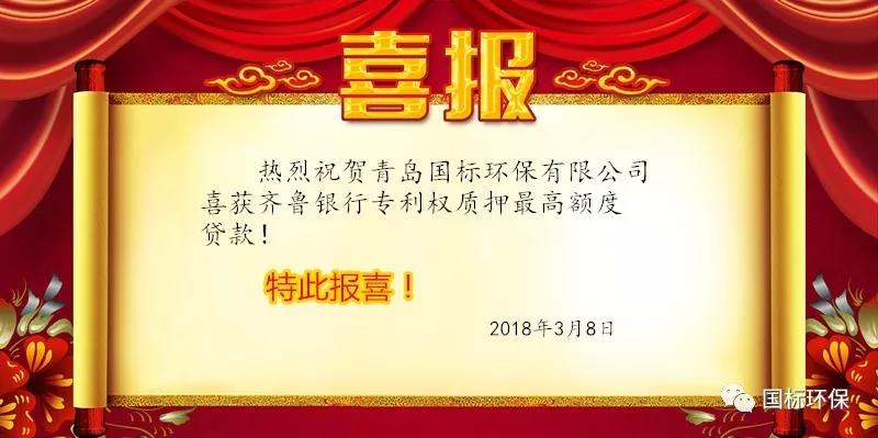 近日,青島國標(biāo)環(huán)保有限公司喜獲齊魯銀行專利權(quán)質(zhì)押首家最高額度貸款。